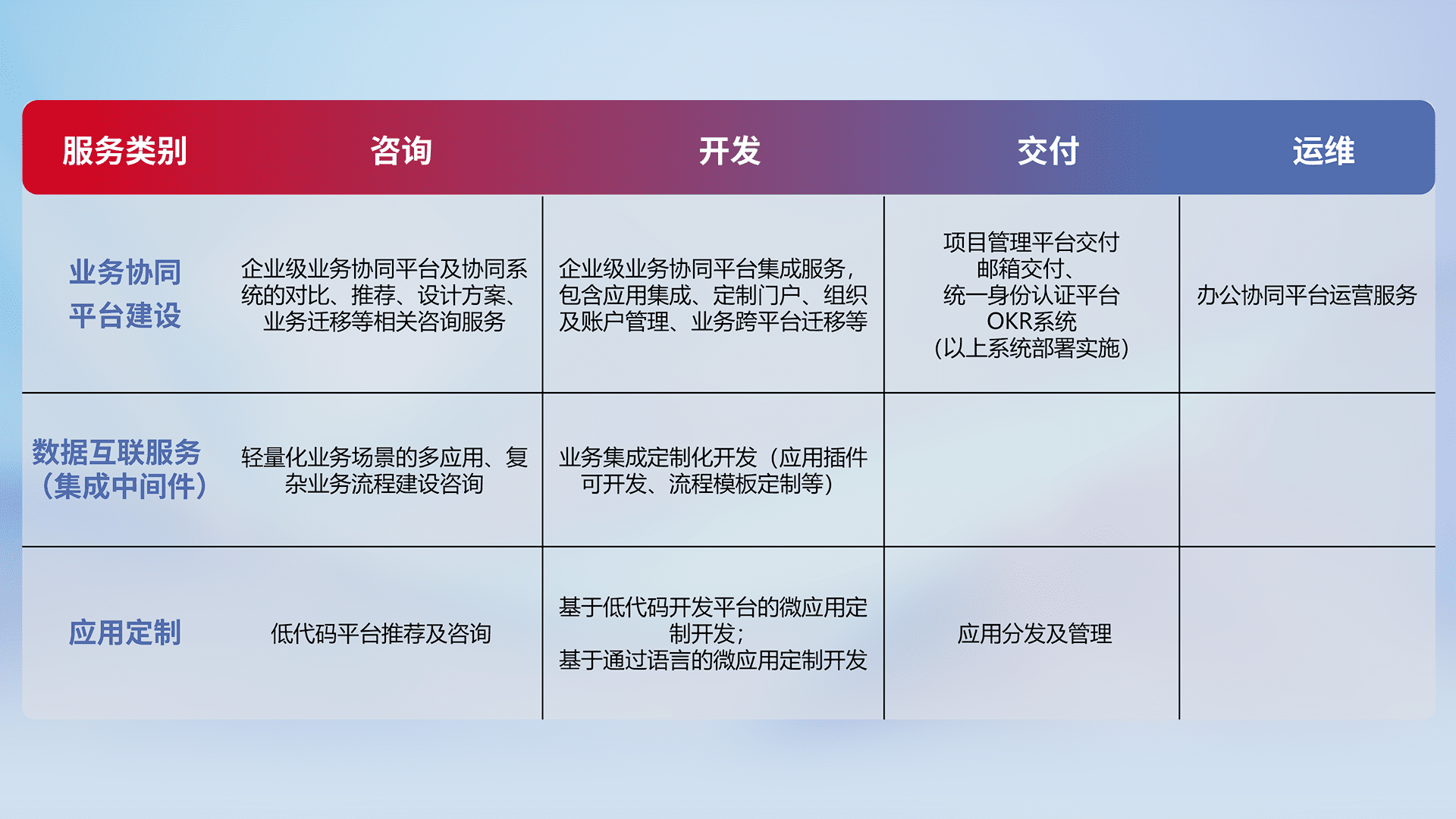 针对钉钉、、、企微、、、、IDaas等平台级产品提供产品的规划、、、、方案、、、交付、、定制化开发等服务,,,,实现如统一协同办公、、智能客户服务、、混合会议管理、、、、智能数据查询、、、、等业务场景,,实现数字化转型。。。。
